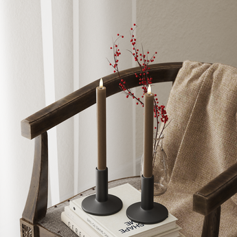Dette elegante LED kronelys i Karamel tilbyder en virkelighedstro 'Real Flame'-effekt, der er så naturtro som et ægte stearinlys. Med en højde på 24 cm og en diameter på 2 cm er hvert LED kronelys omhyggeligt fremstillet i stearin & resin, udstyret med en livagtig 3D-flamme og en unik belægning af resin i toppen. Denne særlige kombination skaber ikke kun en autentisk følelse, men giver også det karakteristiske 'wet look', der efterligner smeltet stearin perfekt.