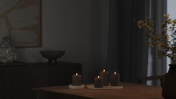 For et roligt helhedsindtryk kan du samle lysene på et fad og variere højderne, mens farverne holdes i samme palette.
